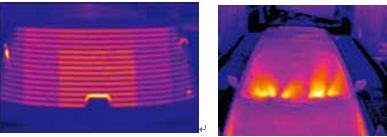 對(duì)電熱絲的加熱狀態(tài)進(jìn)行檢查 (后風(fēng)擋玻璃); 在電熱絲上,檢測(cè)的問(wèn)題部位顯示為熱點(diǎn)(后風(fēng)擋玻璃); 檢測(cè)加熱狀態(tài)下的前風(fēng)擋玻璃上的缺陷顯示為熱點(diǎn); 優(yōu)化車窗除霜參數(shù)。