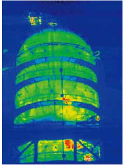 A).建筑外墻及屋頂檢查 – 建筑物的溫度變化顯示了不同區(qū)域散熱能力的差別,因此可由此發(fā)現(xiàn)其中的水分累積及屋頂?shù)睦匣癄顩r。